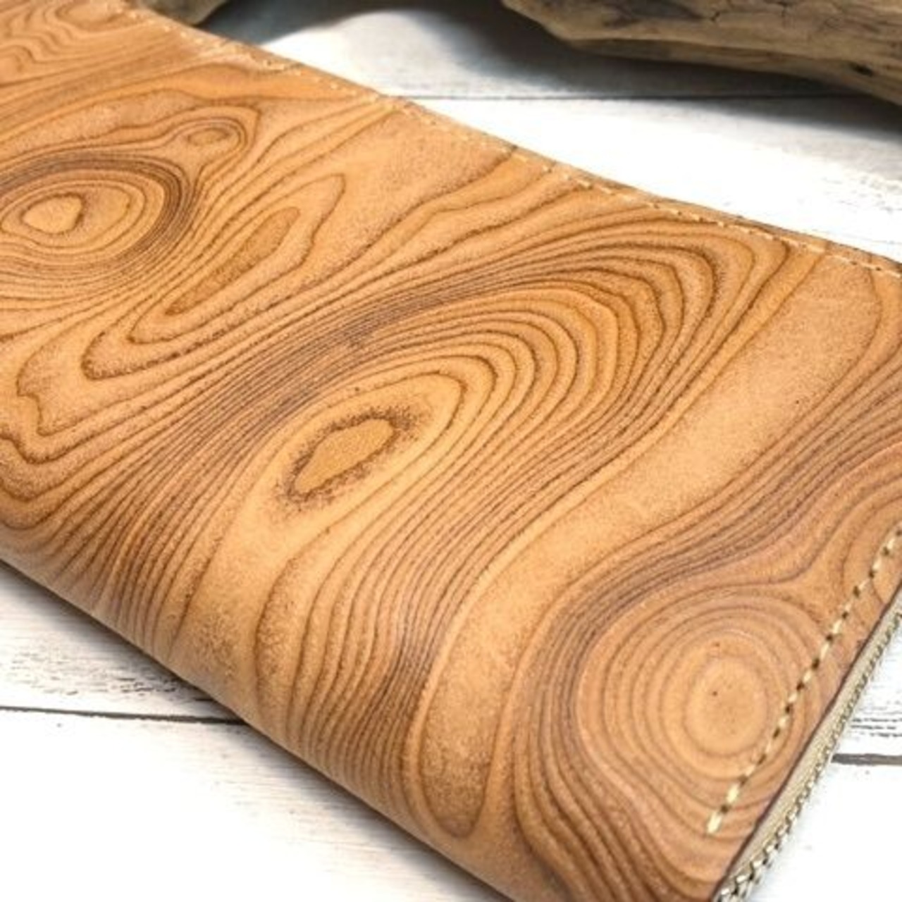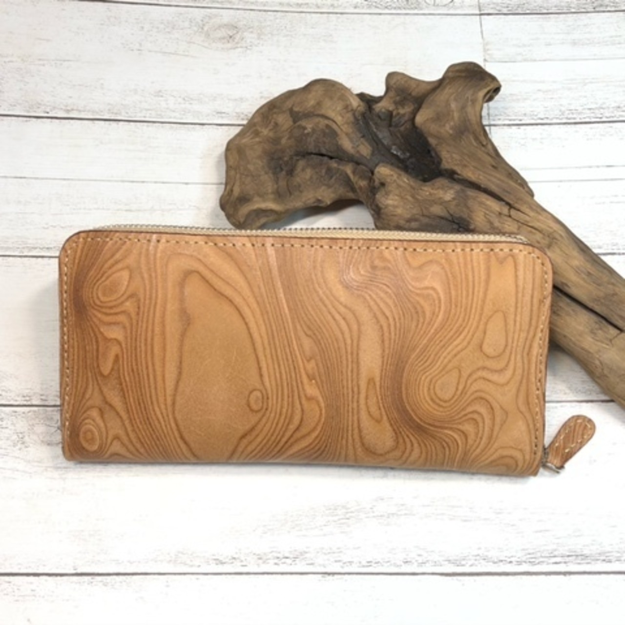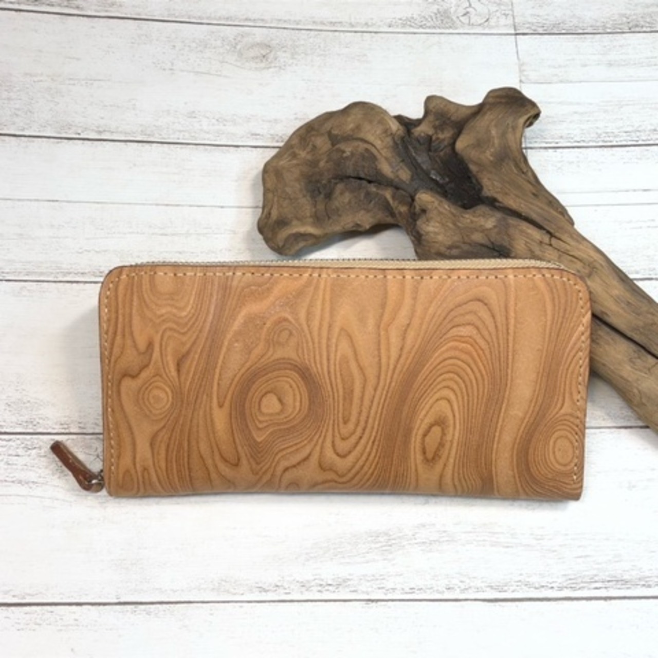 こちらは一見木製かのような雰囲気が特徴の《スキモレザー(漉き模様革)》を使用したファスナータイプの長財布になります。