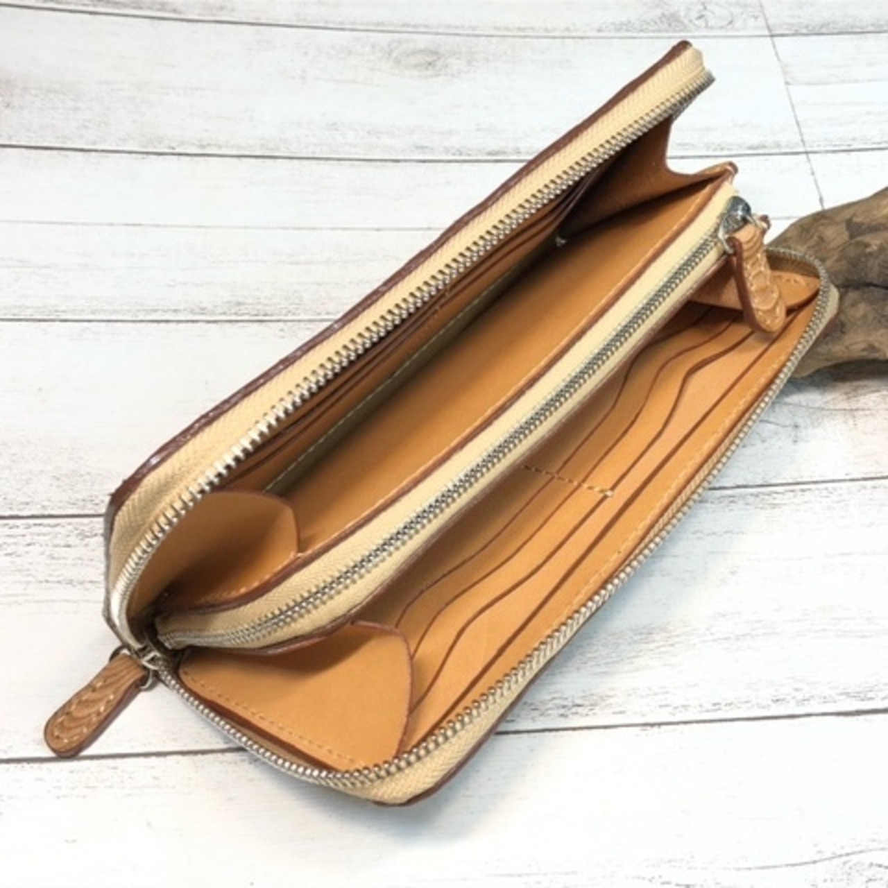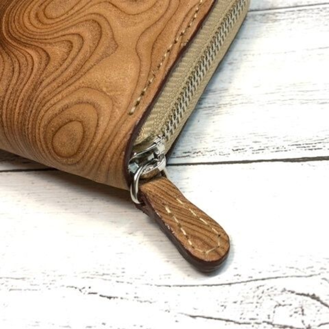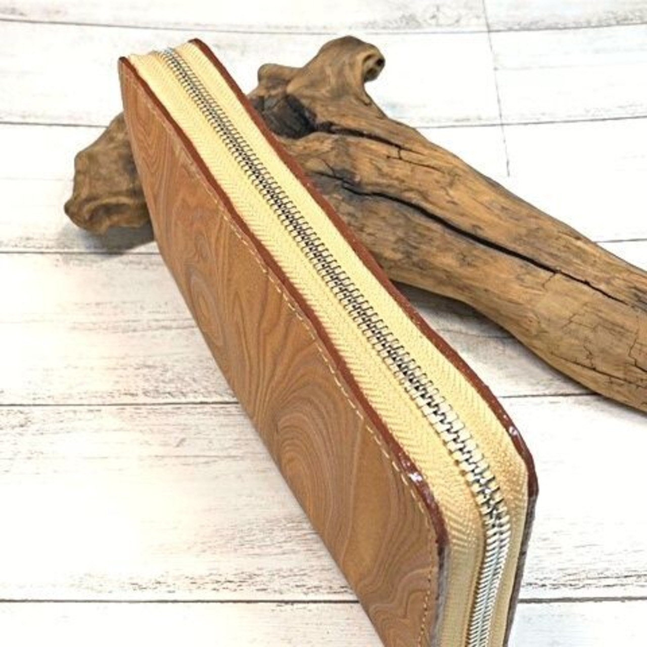 こちらは一見木製かのような雰囲気が特徴の《スキモレザー(漉き模様革)》を使用したファスナータイプの長財布になります。