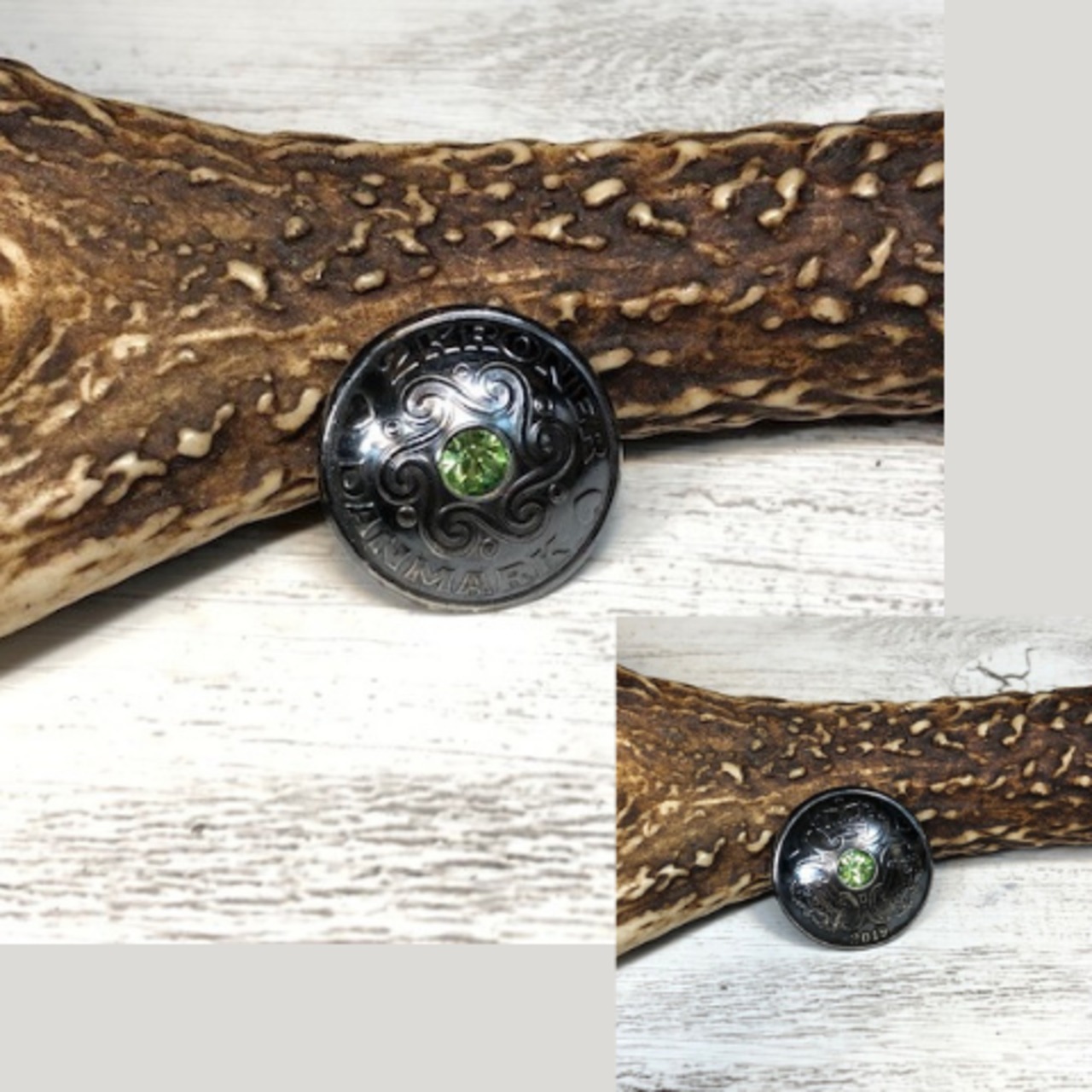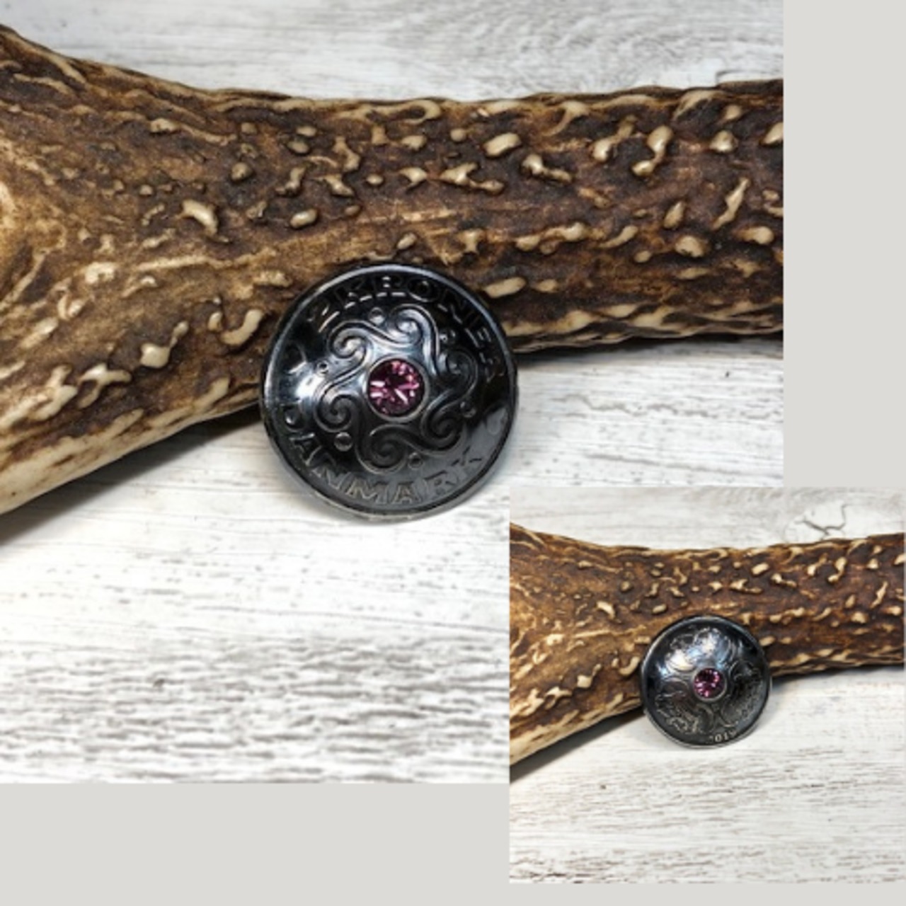 世界で一番幸せな国と言われるデンマークの硬貨《2クローネコイン》を使用したコンチョボタンになります。