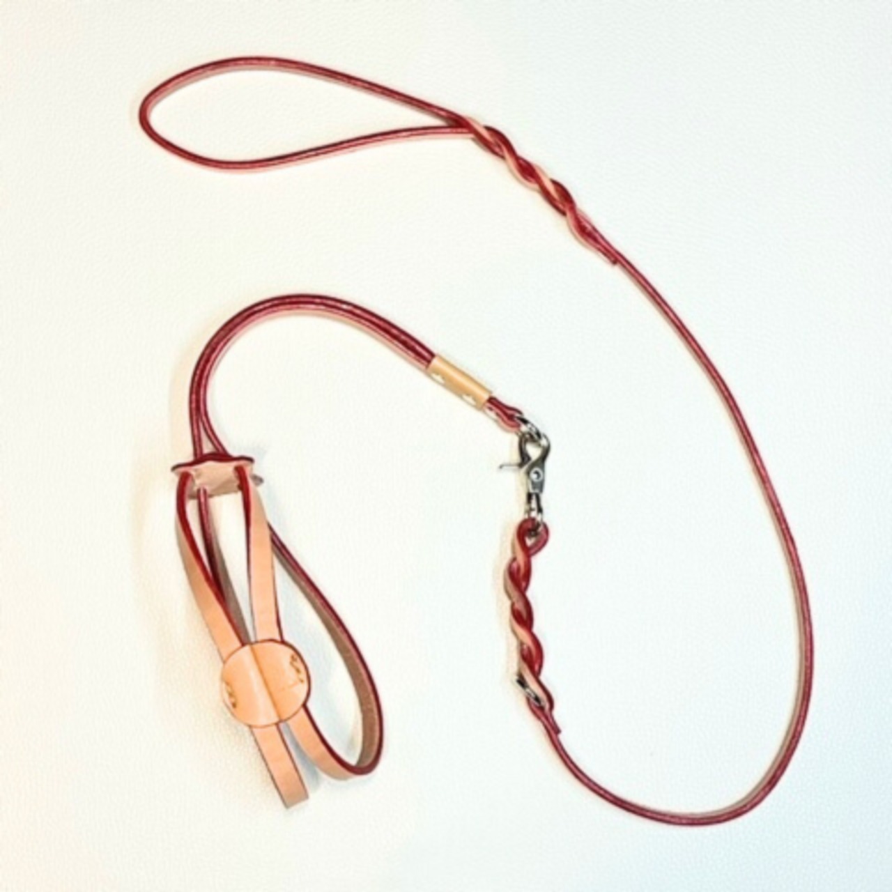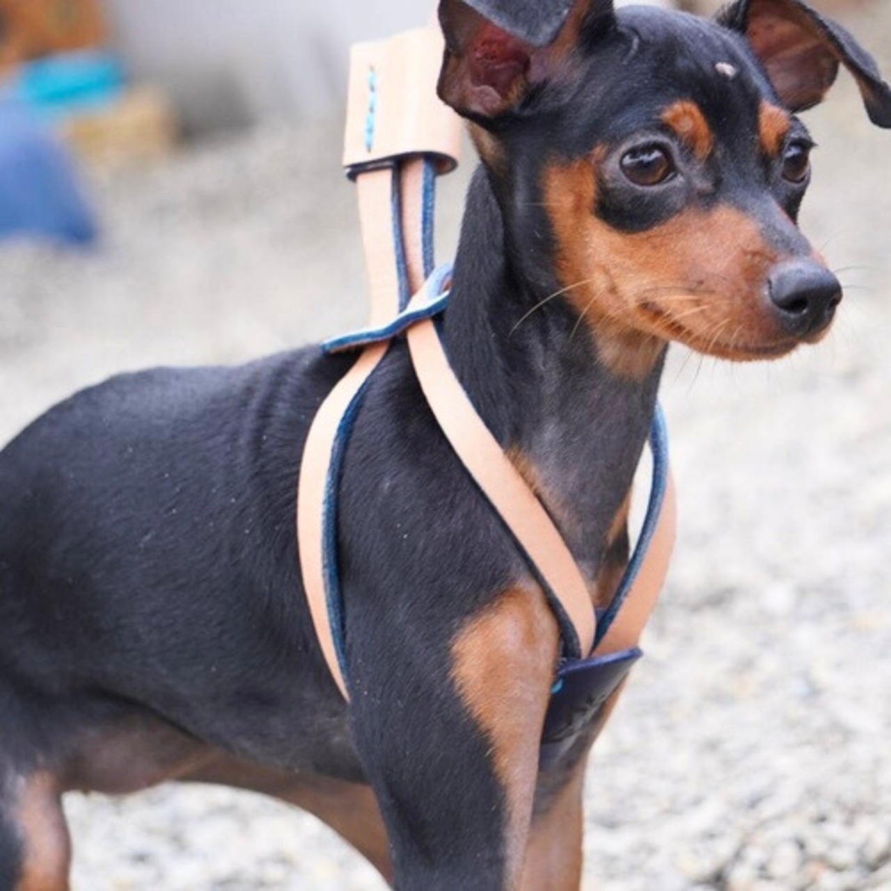 一般的な牛革の中でも特に丈夫なベンズ(背中)部分を使用し一本一本手作業で作成をしております。人工皮革は一切使用せず、全て厚みのある一枚革で製作をしている為ひび割れや破れる心配が極端に少なく、小型犬~中型犬(およそ10㎏程度)まで幅広くご使用いただけます。